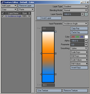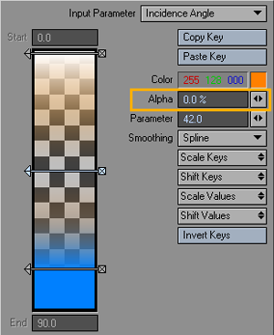 The Value/Color, Alpha, and Parameter fields show the corresponding settings for the current key. This is the key that is highlighted in the Gradient Bar. Click on a key’s arrowhead to select it as the current key. When the panel is active, you can also use your UP and Down Arrow keys to select the preceding or next key as the current key. (Make sure that you do not also have an input field active.) Note: When you edit a surface Color, the value is a color selector. All other types of textures have a numeric input field for value. The Parameter setting determines the current key’s numerical position on the bar. Note that this setting can have decimals. The Value/Color is the texture value or color for the current key. The Alpha setting is the amount of opacity. Higher values are more opaque: 100% is fully opaque and 0% is fully transparent. You can see a background checkerboard when you use Alpha settings below 100%. |