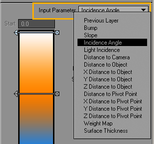 Previous Layer uses the brightness data from the immediately underlying layer. Bump uses the height of surface using the Layout’s Default Unit on the General Options tab of the Preferences panel. Slope changes the parameter based on the angle (in degrees) of the surface relative to the ground (flat on Y axis). Incidence Angle uses the angle (in degrees) of the surface relative to the Camera. Light Incidence is similar to Incidence Angle, but the angle is relative to the selected light. Use the Light pop-up menu that appears. Local Density (HyperVoxels only) uses the density of the HyperVoxel. Distance to... settings change the parameter independently based on the distance from the surface to the selected camera or object. The X, Y, and Z distance settings measure the distance only along the respective axis. If you select the distance to an object, an Object selection pop-up menu will appear. Weight Map uses the weight map selected on the Weight Map pop-up menu. Surface Thickness is a method of faking sub-surface scattering. IMPORTANT: the surface must be set to double-sided and trace transparency needs to be activated. Note: Other Input Parameter options may be