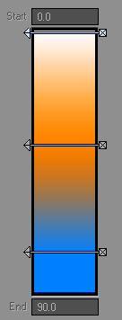 The Gradient Bar OK, once you determine your Input Parameter, you need to set the value of the new texture color/value. The Gradient Bar is where you graphically set your key values. (A key is characterized by three numbers: its value, parameter, and alpha.) As with envelopes, you can create, edit, and delete keys. The keys change the color of the gradient and ultimately the parameter values. If the parameter is a color, the bar is in color and color transitions appear from one key to the next. If the parameter relates to numeric values, the bar appears in grayscale. The lowest set key value is black and the highest is white. The Start and End fields, at the top and bottom of the Gradient Bar, respectively, set the beginning and end of the visible area of the gradient. Whether or not these values are editable, depends on the Input Parameter you selected; however, their default values should work for most situations. Also, you can set keys outside this range. To add a key: 1 Click on the Gradient bar and hold down your LMB. A key marker that looks like an arrow will appear. If you continue to hold the mouse button down, you can drag to refine the position of your key. The Parameter field will change as you drag your mouse. Note that this value is not limited to whole numbers. Note: To prevent accidentally adding a new key, you can drag the key using the arrowhead. 2 Release the mouse button to create the key. To delete an existing key: Click on the end of the arrow. |