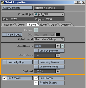 Objects that have Unaffected by Fog selected will be excluded from the fog effect. Also, the fog Level setting, to the right of the Unaffected by Fog option, will let you apply an amount less than or greater than normal. Normal is 100%. Unseen By Camera An alternative to making an object 100-percent dissolved is to activate Unseen by Camera. This makes the object invisible to the camera when you render; however, you will still be able to see it and work with it in the Layout window. Although the camera won’t see these objects, lights will. You can use this option to cast fake shadows into your scene from off-screen objects, like window pane frames. |