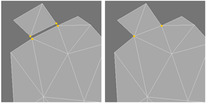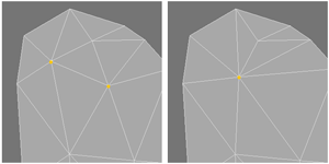 Terminology The simplification algorithm is based on contractions of vertex pairs. It supports two types of contractions: edge and non-edge contractions. An edge contraction occurs when the vertex pair shares an edge. This is the primary type of contraction that occurs during the reduction stage (in fact, non-edge contractions are turned off by the default parameters). The following figure shows an example of an edge contraction where vertex v1 and vertex v2 are joined to form a new vertex v3. Since v1 and v2 share an edge (highlighted below), one or more triangles will always be removed during this contraction. In this example, two triangles are eliminated from the mesh. |